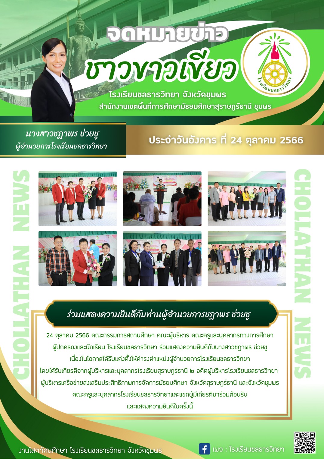 ร่วมแสดงความยินดีกับท่านผู้อำนวยการชฎาพร ช่วยชู เนื่องในโอกาสเข้ารับตำแหน่งผู้อำนวยการโรงเรียนชลธารวิทยา